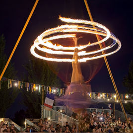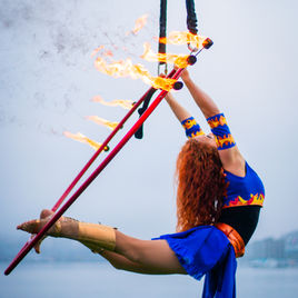 Double the fire and acrobatic action, Phoenix and Fireheart features two funny women, who have come together to put on a show (and somehow stay friends at the end!) Between the two, they swing from trapezes, silks and lyras, balance upside down, eat, spin and throw fire, and hit targets with medieval weapons that when women get their hands on, theres bound to be danger! To top it all off, they twist, flip and spin together in their fire heart in the air. Full show runs 30 minutes. Fully customizable.